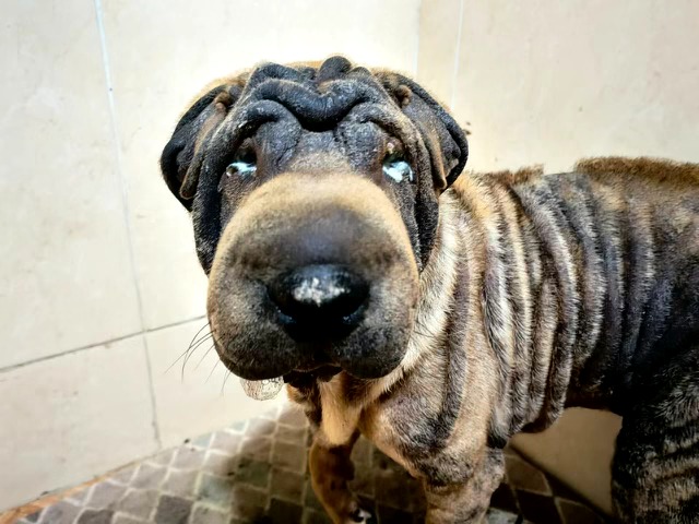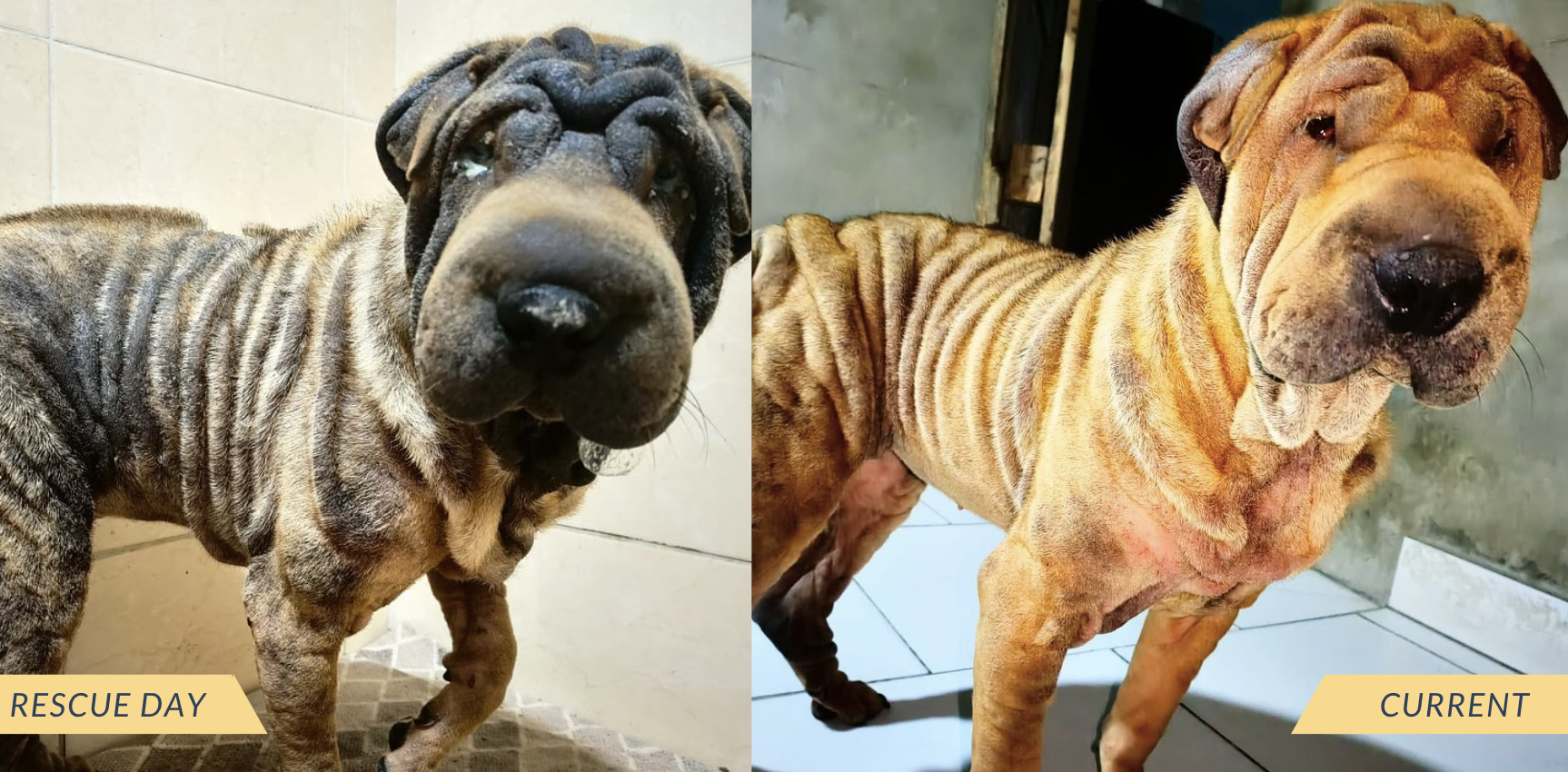 For days, Lia, a frightened and tormented Shar Pei wandered the streets after her “family” tossed him from the car and left her on the streets. Fortunately, our rescue happened to be passing through a town to help another dog in need when our boots-on-the-ground rescuer watched locals try to catch this girl who was in awful health condition. After eluding rescuers for a while, she was finally brought to our rescue with raw skin, hunger pains, and a broken heart. But despite the pain of her past, we are happy knowing that she is safe and finally receiving the basic necessities for her scabies and malnourishment.
